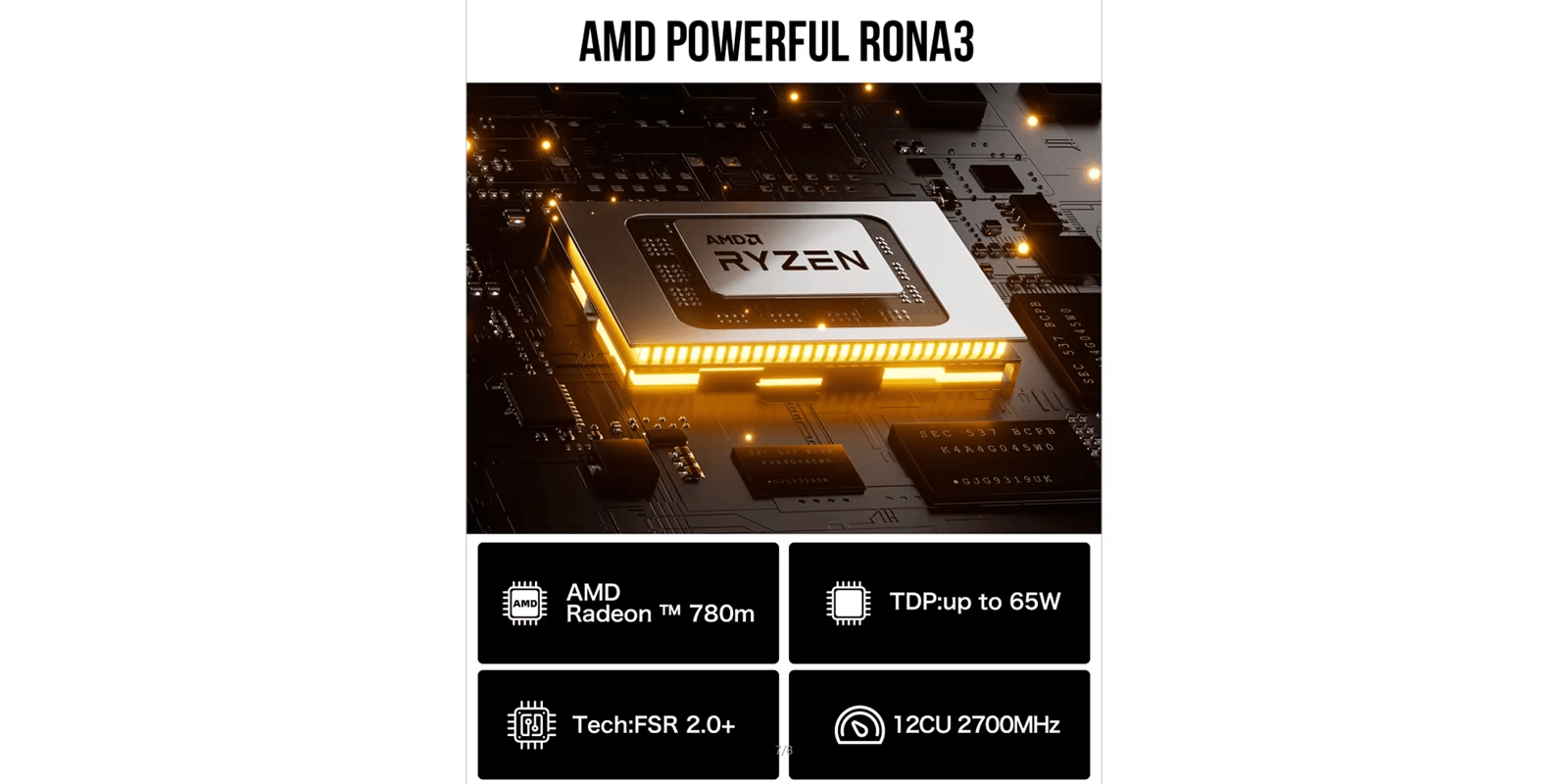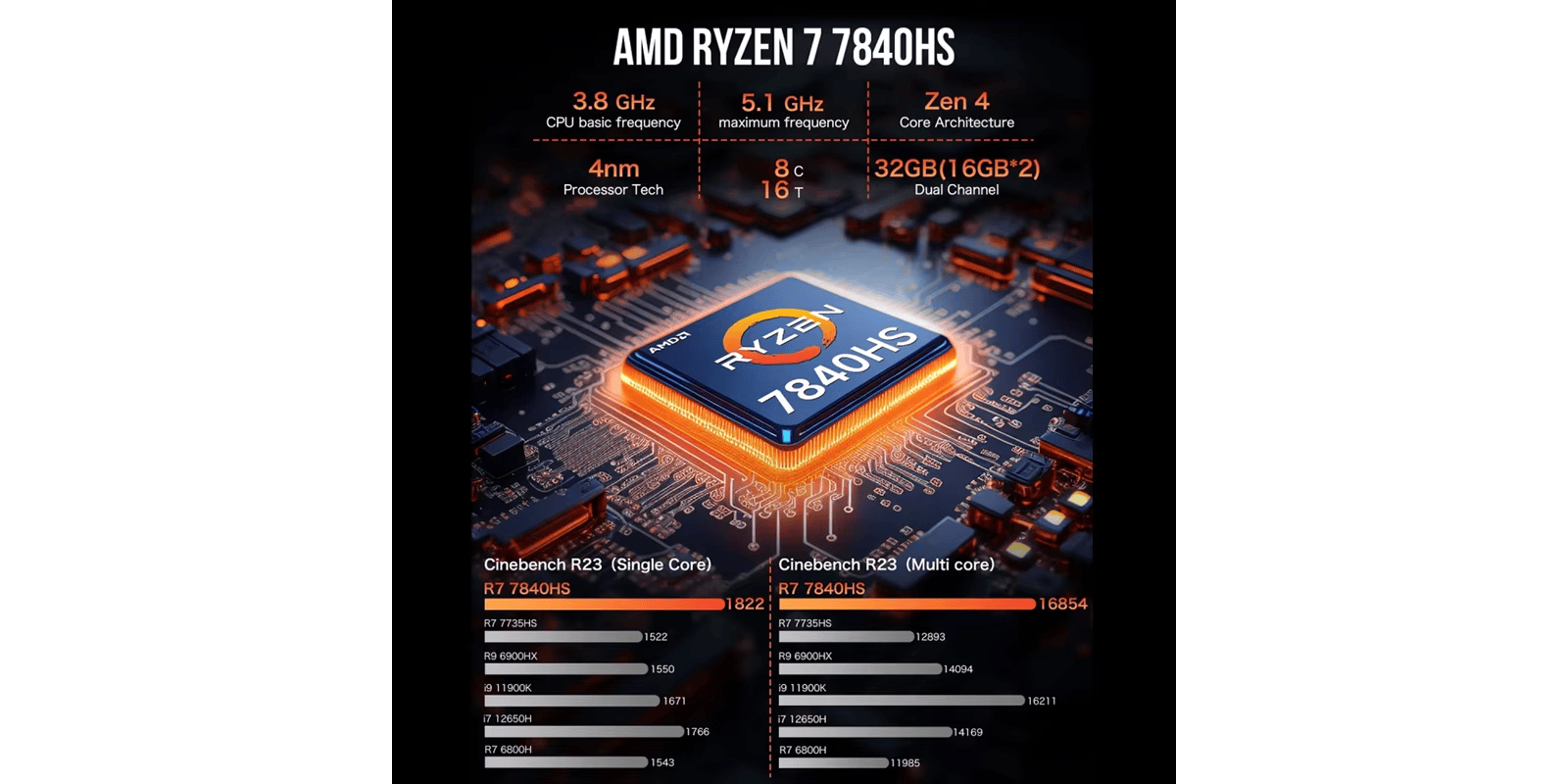 - Compact mini PC with powerful AMD R7-7840HS processor